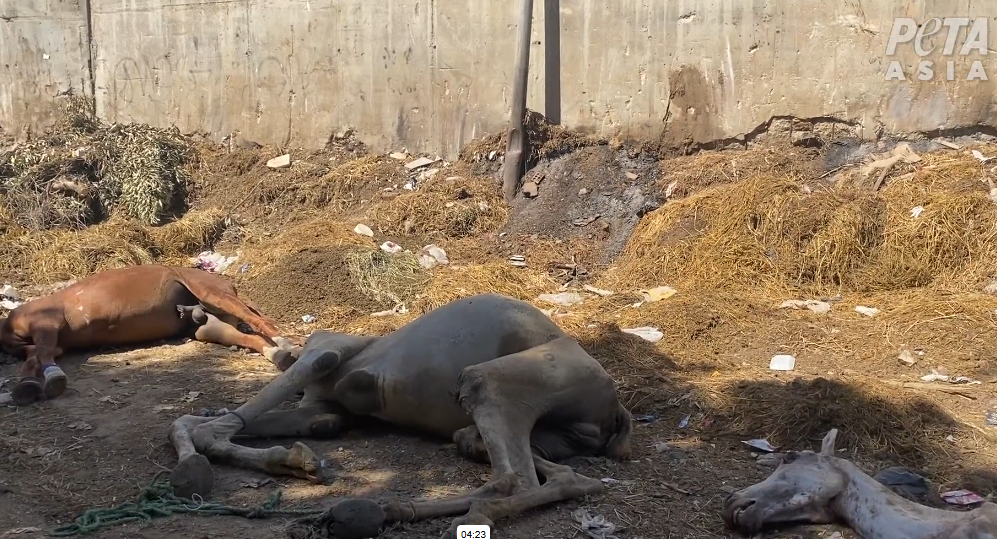 (After the working horses die from overwork and injuries, they are not buried with dignity; instead, their bodies are often seen to be abandoned in open spaces, with passersby seemingly indifferent. Photo source: PETA)